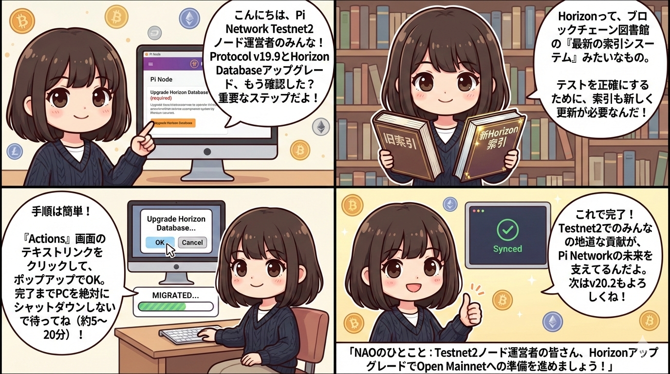 2026年2月24日現在、Pi Networkで実際にノードを運営している方の大半はTestnet2を選択しています。そんなTestnet2ノード運営者の皆さんに向けて、Protocol v19.9への対応とHorizon Databaseアップグレードについて、画面に沿った具体的な手順を中心に解説します。